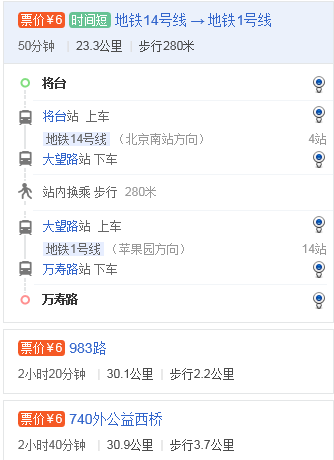 將臺(tái)路到海淀萬(wàn)壽路23.3公里,坐地鐵14號(hào)線4站,到大望路站轉(zhuǎn)地鐵一號(hào)線14站到達(dá)。具體位置和線路如圖所示。